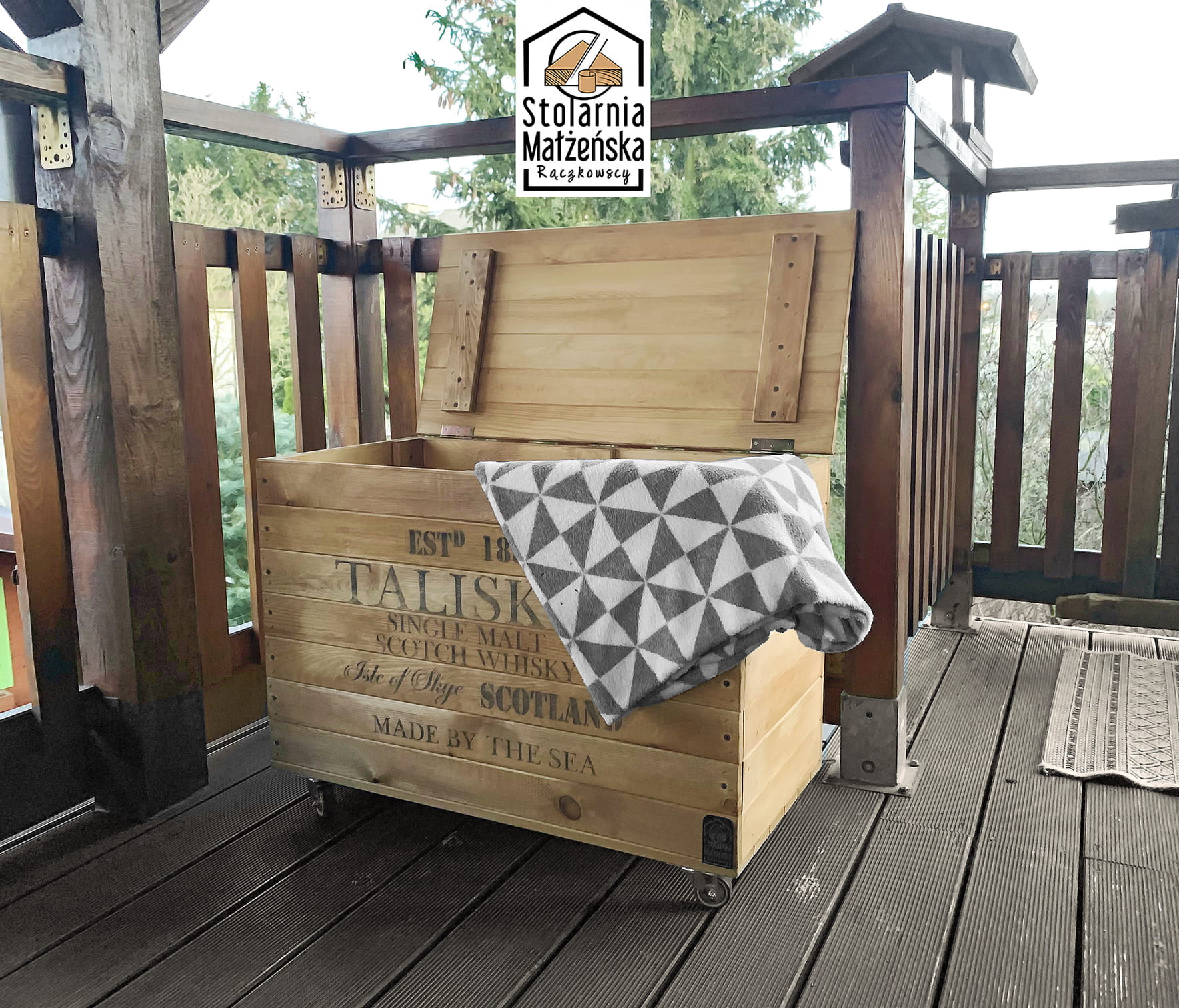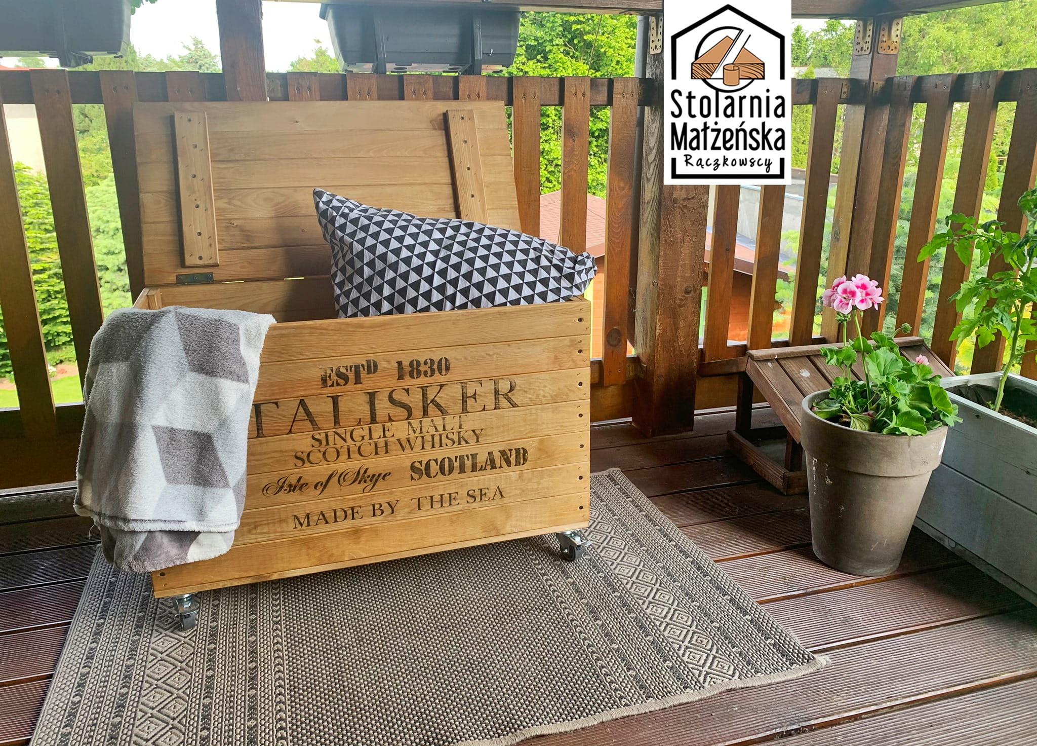 Skrzynia drewniana, na kółkach, z napisami Talisker